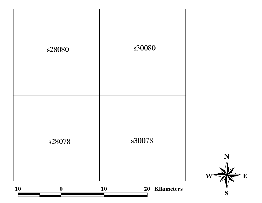 Each data-file or grid tile covers an area of 20km by 20km, divided into 50 metre cells. Four such tiles as illustrated in Figure 6 cover the Cairngorms. As individual tiles their use was limited and consequently they needed linking together. Most proprietary GIS packages, including Arc/Info allow DTMs to be combined either by joining adjacent models or by merging overlapping models. For grid DTMs joining is only straightforward if they correspond in grid resolution, orientation, etc., otherwise 'resampling' is required to establish continuity. Additionally, merging DTMs can pose problems when the data is of conflicting attributes (elevation and gradients) with varying degrees of accuracy but fortunately, as all the terrain data used originated from EDX these problems were not met.Figure 6. The EDX Data Tiles used to cover the Cairngorms