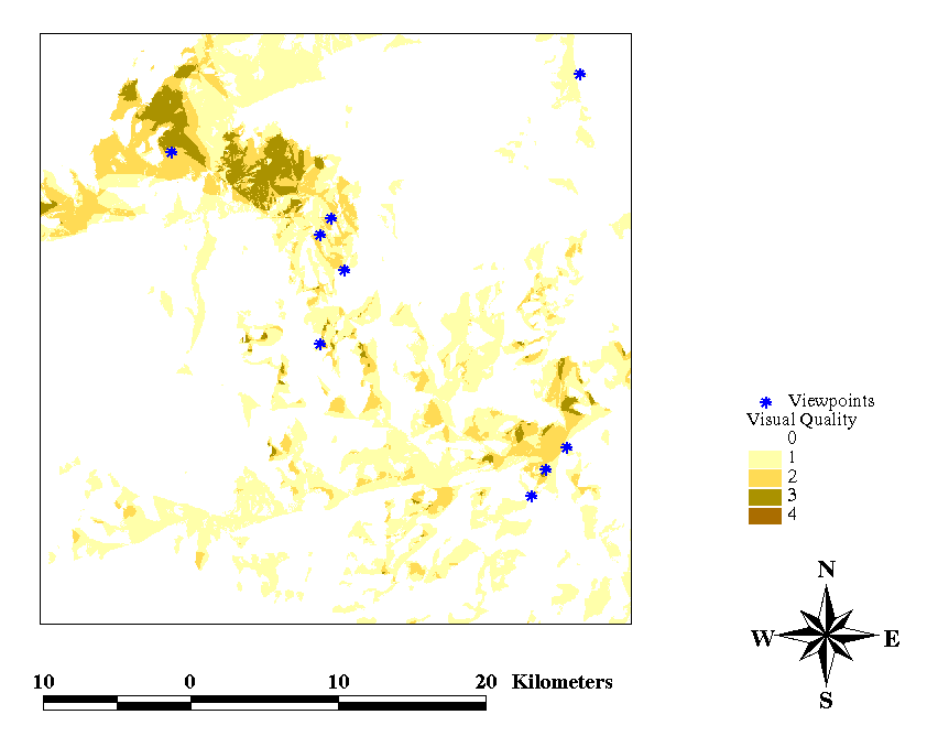 Miller & Law (1997) and Miller, Brooker & Law (1997) produced a visibility census for the whole of Scotland. However, instead of selecting viewpoints they located points at 5km intervals. Their work also emphasises the intense computer processing needed for visibility calculations as their trial analysis on an area of 40 x 40 points using the Grid module of Arc/Info took approximately twelve days.